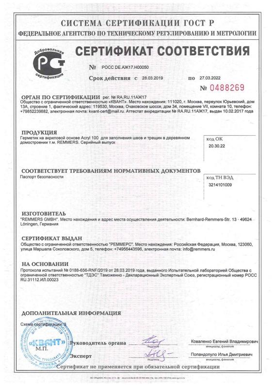Сертификат ЕВРАЗЭС на материалы герметизирующие, заполняющие и клеящие на акриловой основе т.м. Remmers