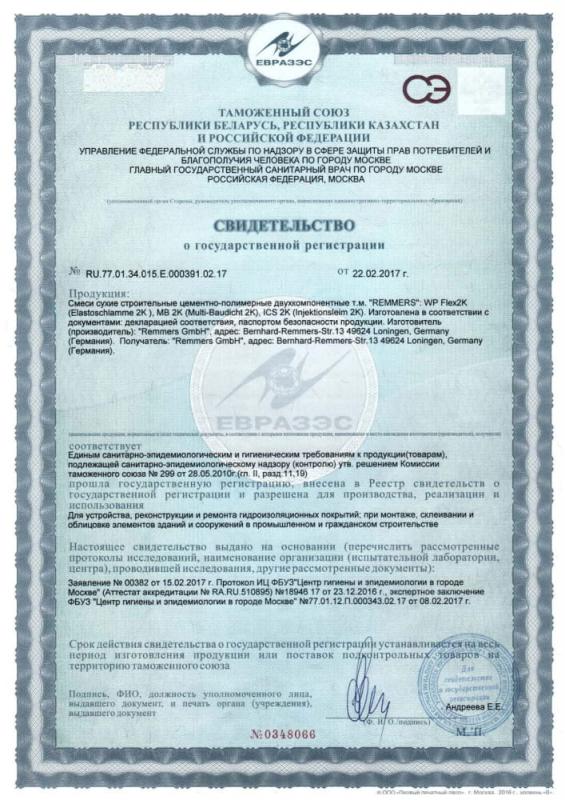 Сертификат ЕВРАЗЭС на смеси сухие строительные цементно-полимерные двухкомпонентные т.м. "REMMERS"