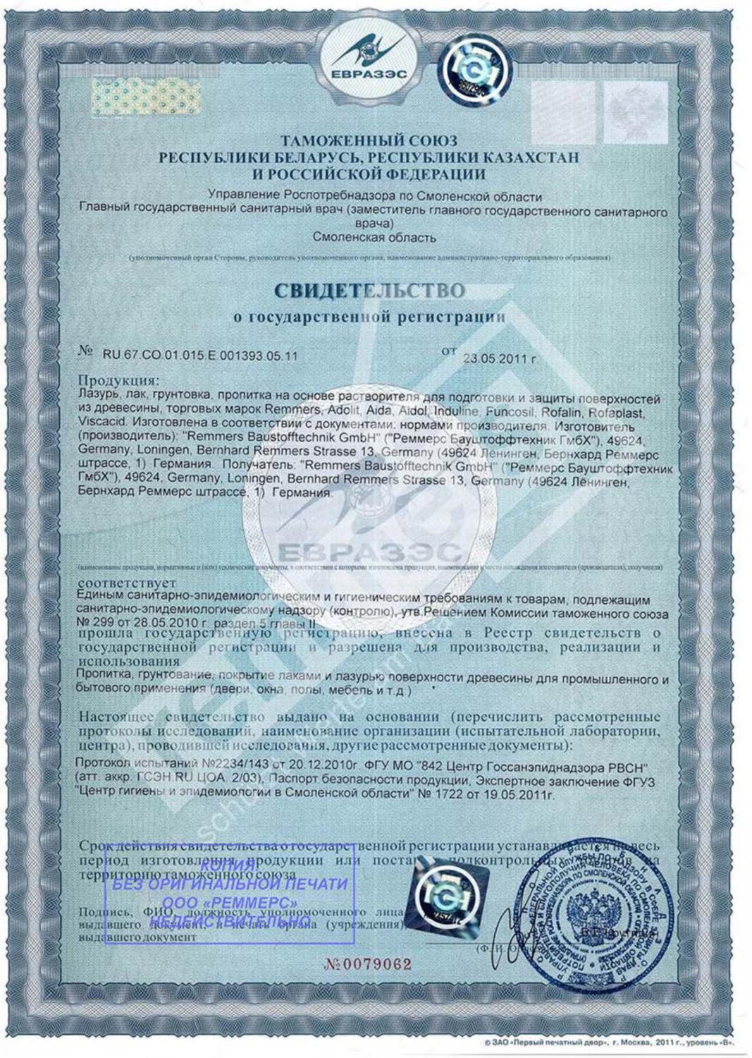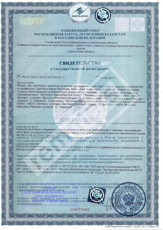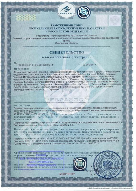 Сертификат ЕВРАЗЭС на лазурь, лак, грунтовку, пропитку на основе растворителя для подготовки и защиты поверхностей из древесины торговых марок Remmers, Adolit, Aida, Aidol, Induline, Funcosil, Rofalin, Rofaplast, Viscasid