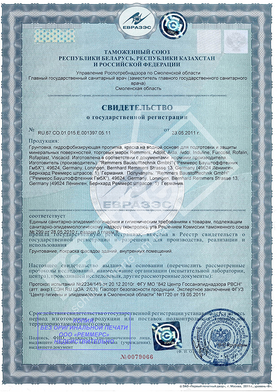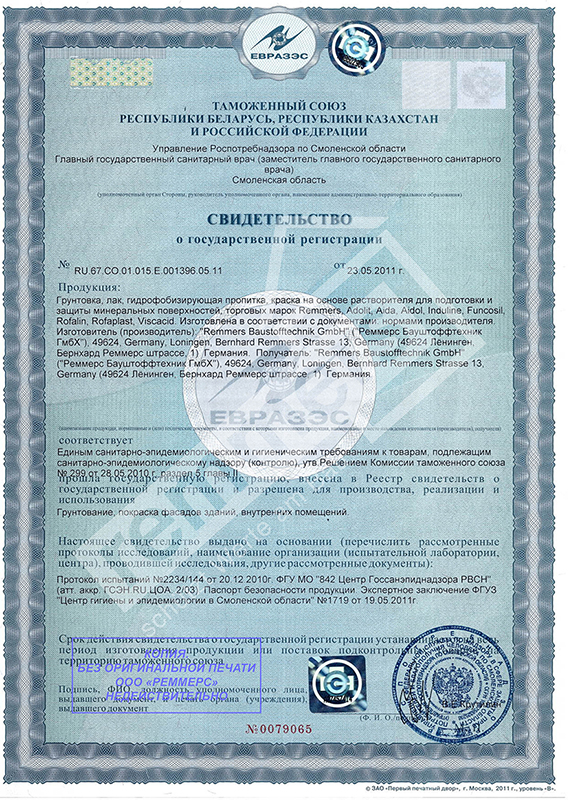 Сертификат ЕВРАЗЭС на грунтовки, лаки гидрофобизирующие пропитки, краски на водной основе для подготовки и защиты минеральных поверхностей под торговыми марками Remmers, Adolit, Aida, Aidol, Induline, Funcosil, Rofalin, Rofaplast, Viscacid