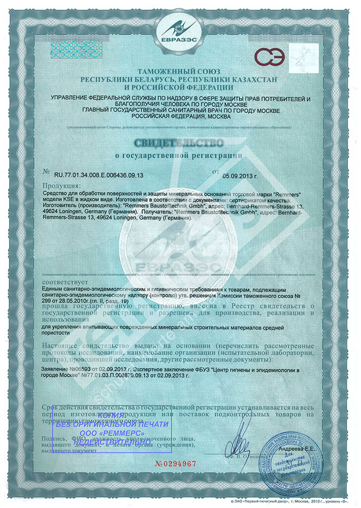 Сертификат ЕВРАЗЭС на средство для обработки поверхностей и защиты минеральных оснований торговой марки Remmers серии KSE