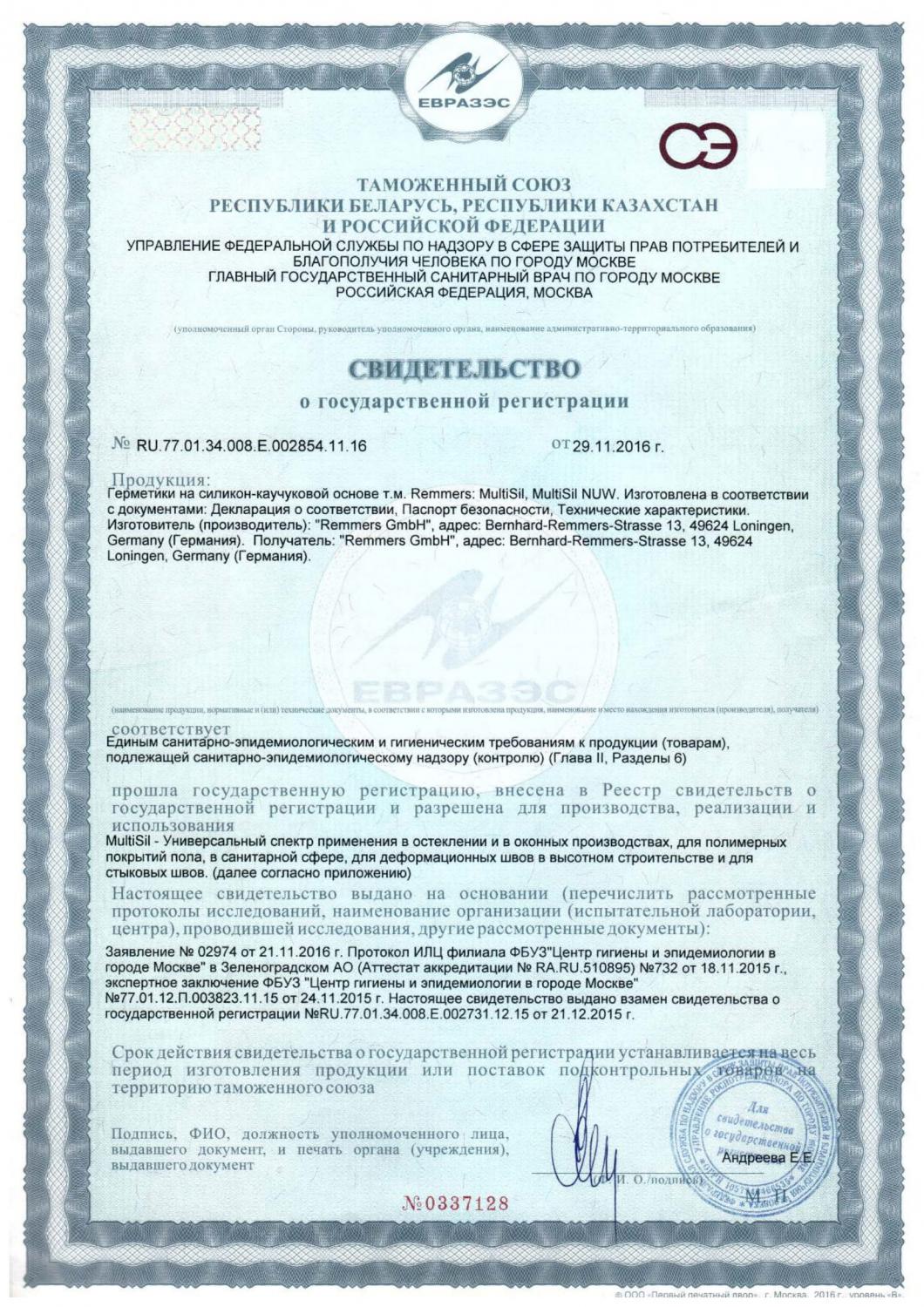 Сертификат ЕВРАЗЭС на герметики на силикон-каучуковой основе т.м. Remmers: MultiSil, MultiSil NUW