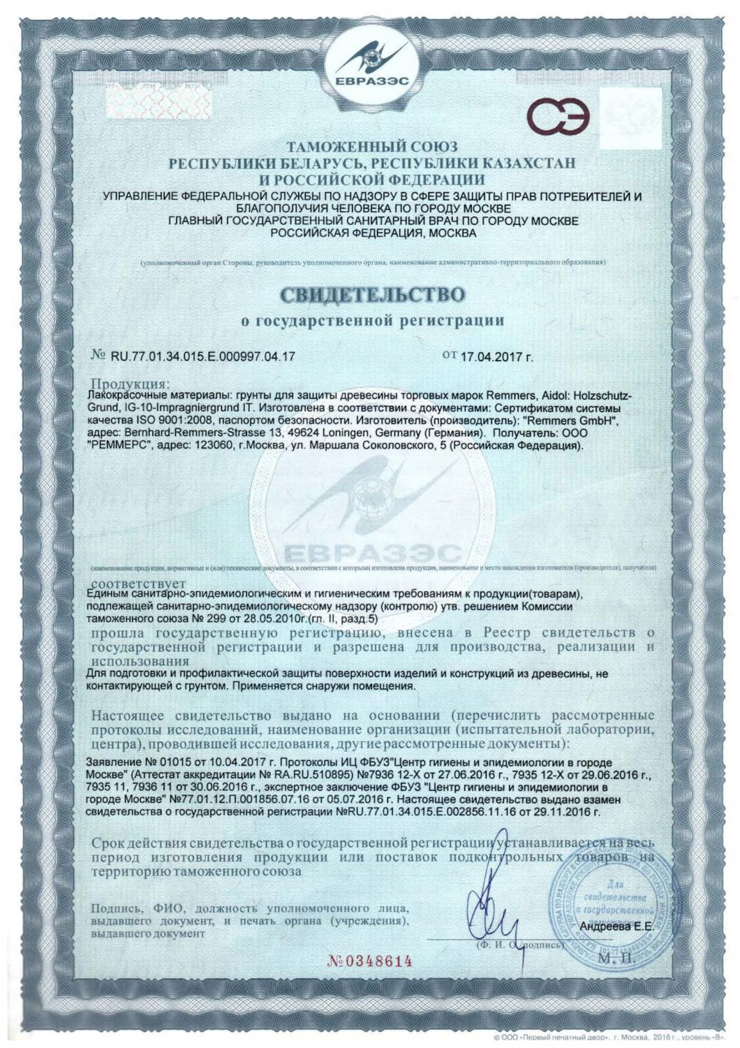 Сертификат ЕВРАЗЭС на лакокрасочные материалы: грунты для защиты древесины торговых марок Remmers, Aidol
