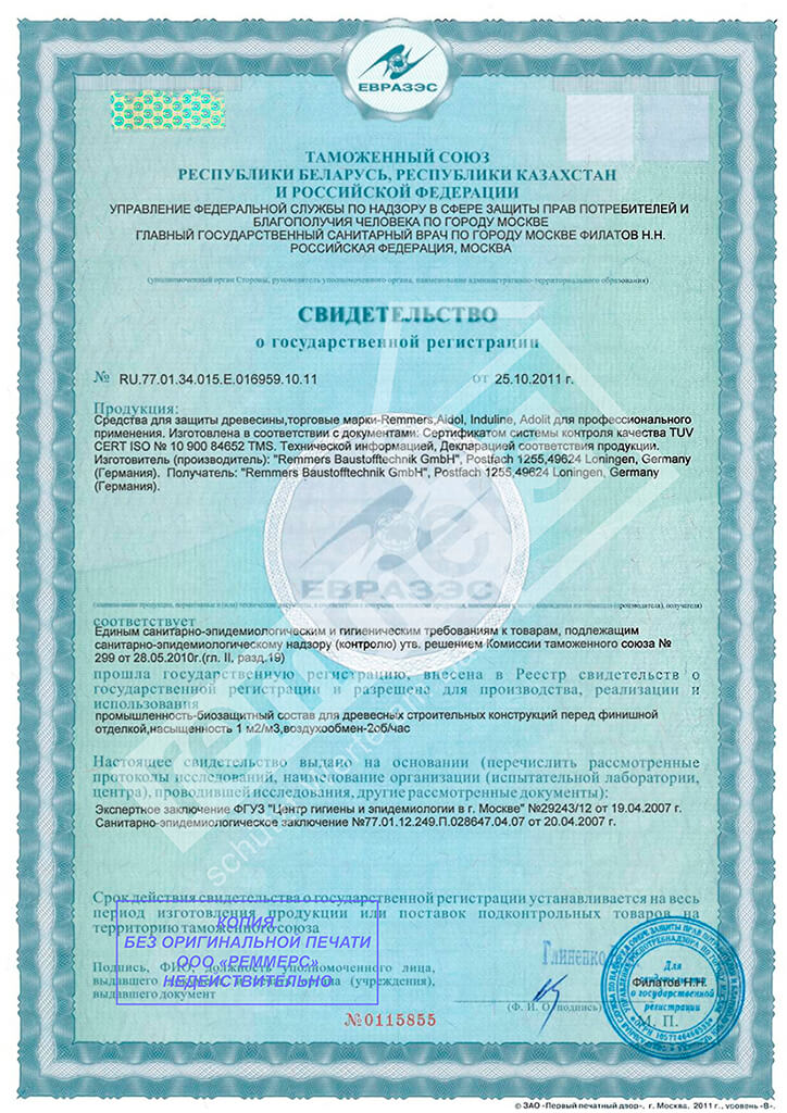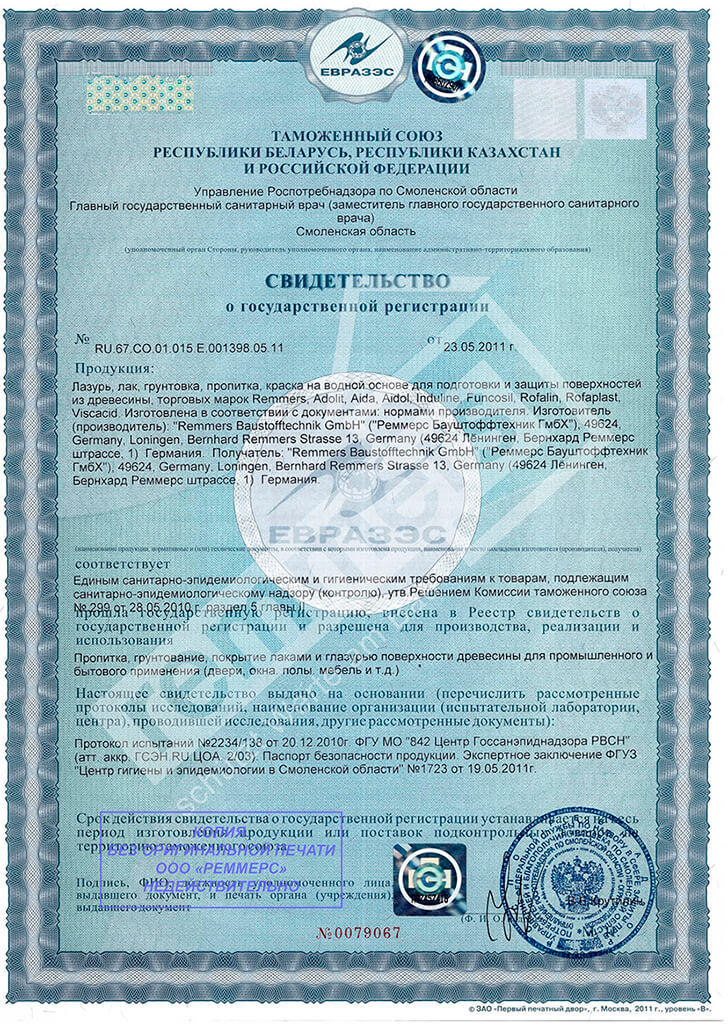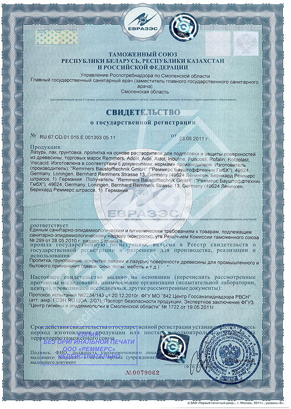 Сертификат ЕВРАЗЭС на лазури, лаки, грунтовки, пропитки на основе растворителя для подготовки и защиты поверхностей из древесины под торговыми марками Remmers, Adolit, Aida, Aidol, Induline, Funcosil, Rofalin, Rofaplast, Viscacid