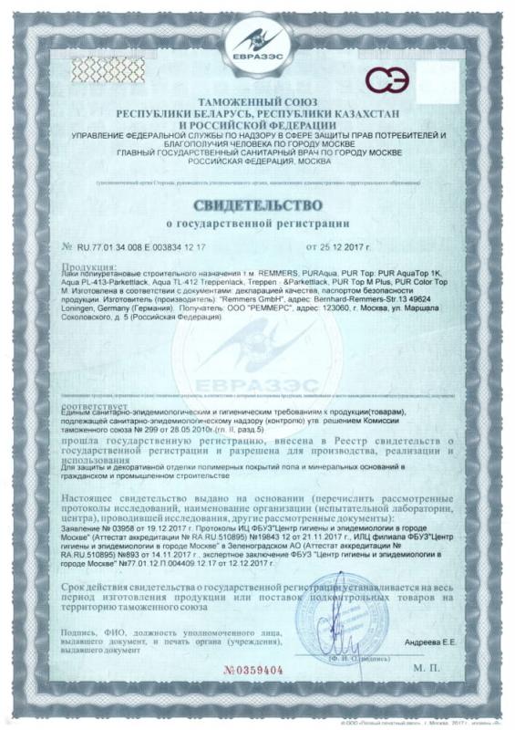 Сертификат ЕВРАЗЭС на лаки полиуритановые строительного назначения т.м. REMMERS, PURAqua, PUR Top, PUR AquaTop 1K, Aqua, PL-412-Parkettlack, Aqua TL-412 Treppenlack, Treppen &Parkettlack, PUR Top M Plus, PUR Color Top M