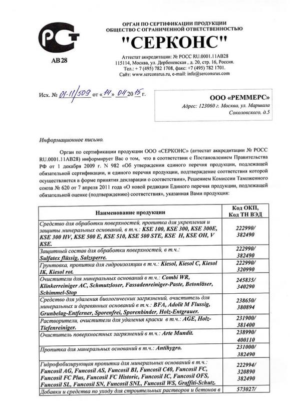 Сертификат ЕВРАЗЭС на очистители для минеральных оснований под торговыми марками Remmers, Aidol, Induline, Funcosil, Verdunning