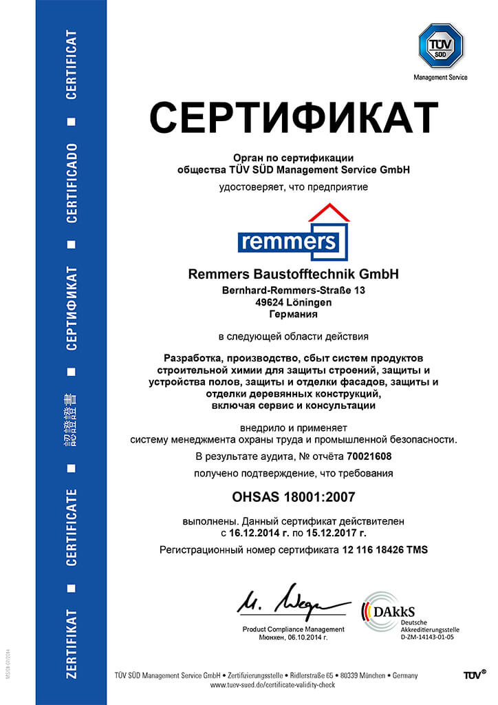 Сертификат ЕВРАЗЭС на средства для защиты древесины под торговыми марками Remmers, Aidol, Induline, Adolit