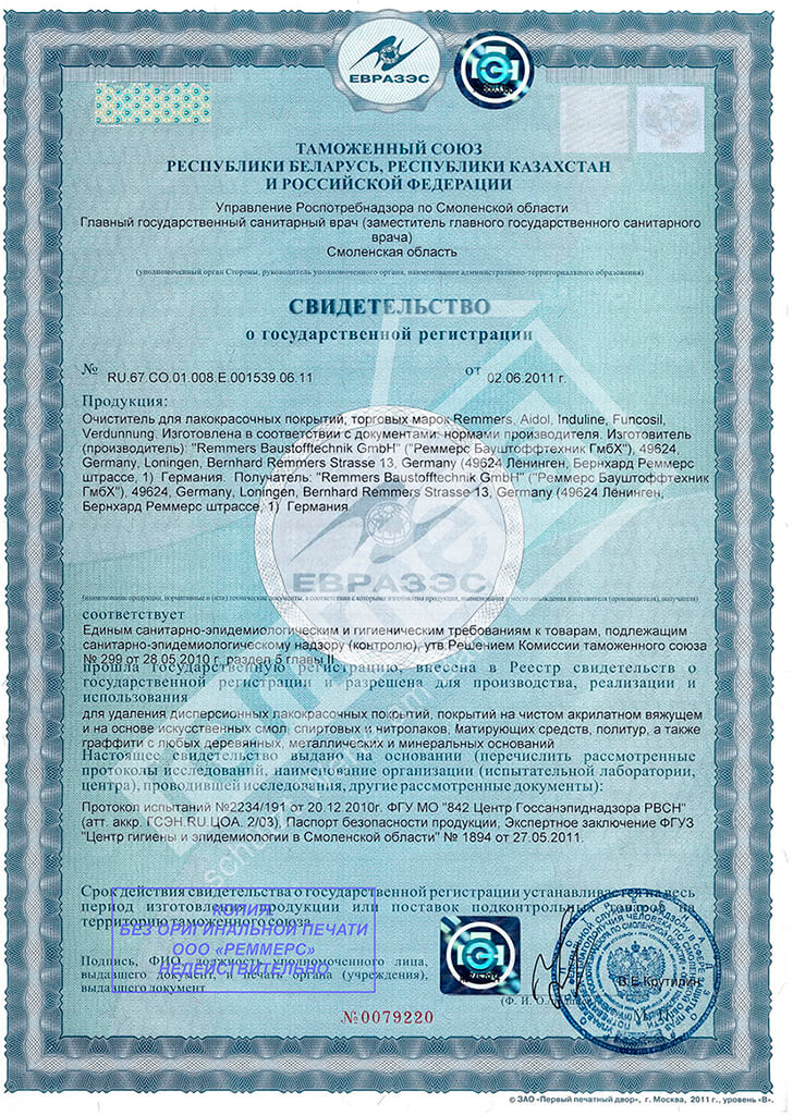 Сертификат ЕВРАЗЭС на очистители для лакокрасочных покрытий под торговыми марками Remmers, Aidol, Induline, Funcosil, Verdunning