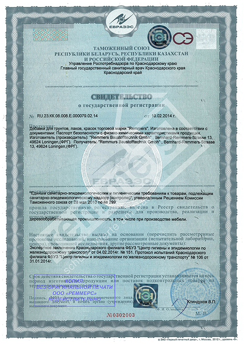 Сертификат ЕВРАЗЭС на добавки для грунтов, лаков, красок под торговой маркой Remmers
